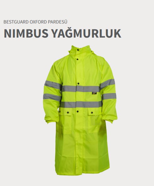 Bestguard Nimbus Yağmurluk, Oxford kumaş, reflektörlü tasarım ve su geçirmezlik özellikleriyle zorlu hava koşullarında yüksek görünürlük ve güvenli çalışma imkânı sunar.